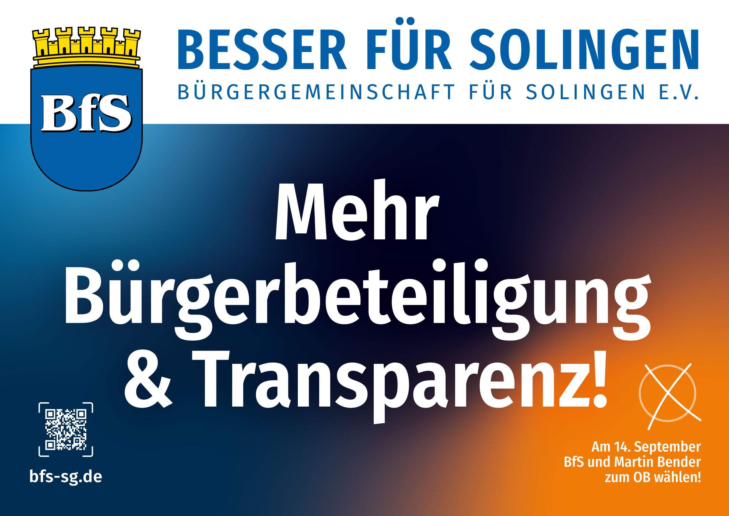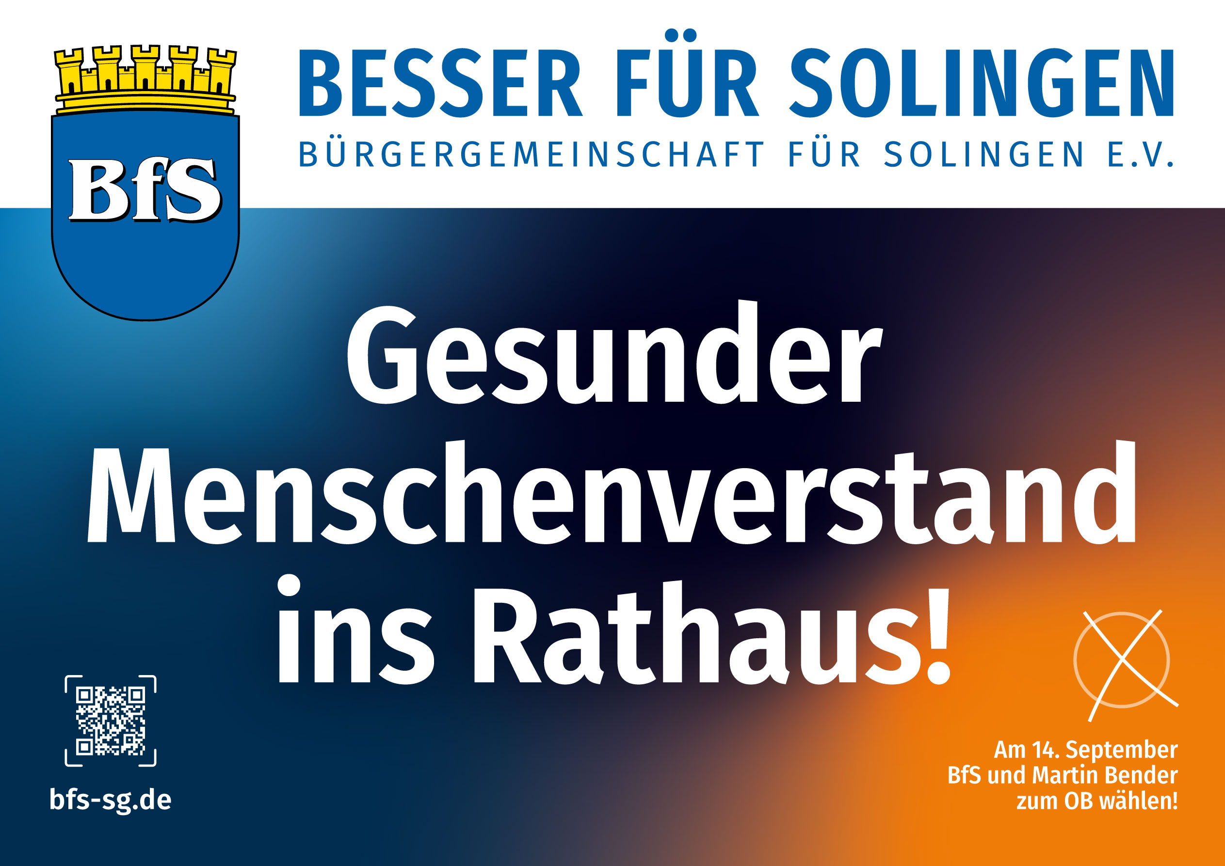 Darum bitte ich am 14. September um Ihr Vertrauen – für eine starke BfS im Rat und für mich als Ihren Oberbürgermeister. Mit der BfS gestalten wir ein sicheres, modernes und lebenswertes Solingen. Gemeinsam, entschlossen und bürgernah – mit klarer Stimme für: