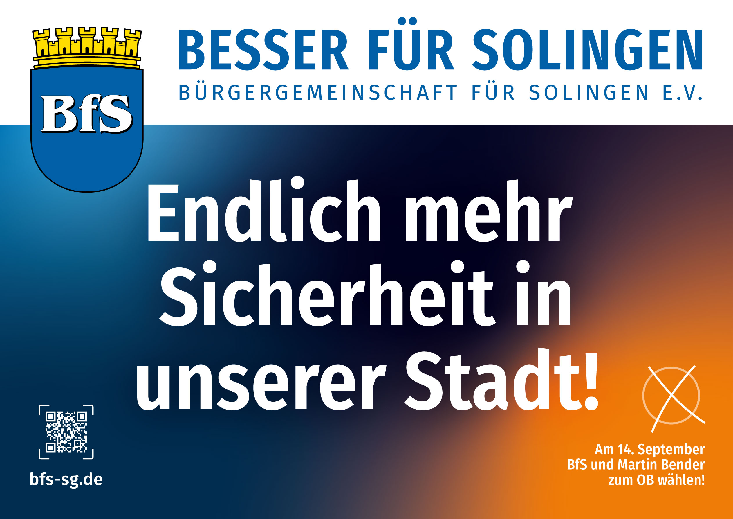 Sicherheit ist ein Grundbedürfnis und die Basis für ein gutes Zusammenleben in unserer Stadt. Die BfS setzt sich dafür ein, dass Solingen in allen Stadtteilen sicherer, sauberer und lebenswerter wird.